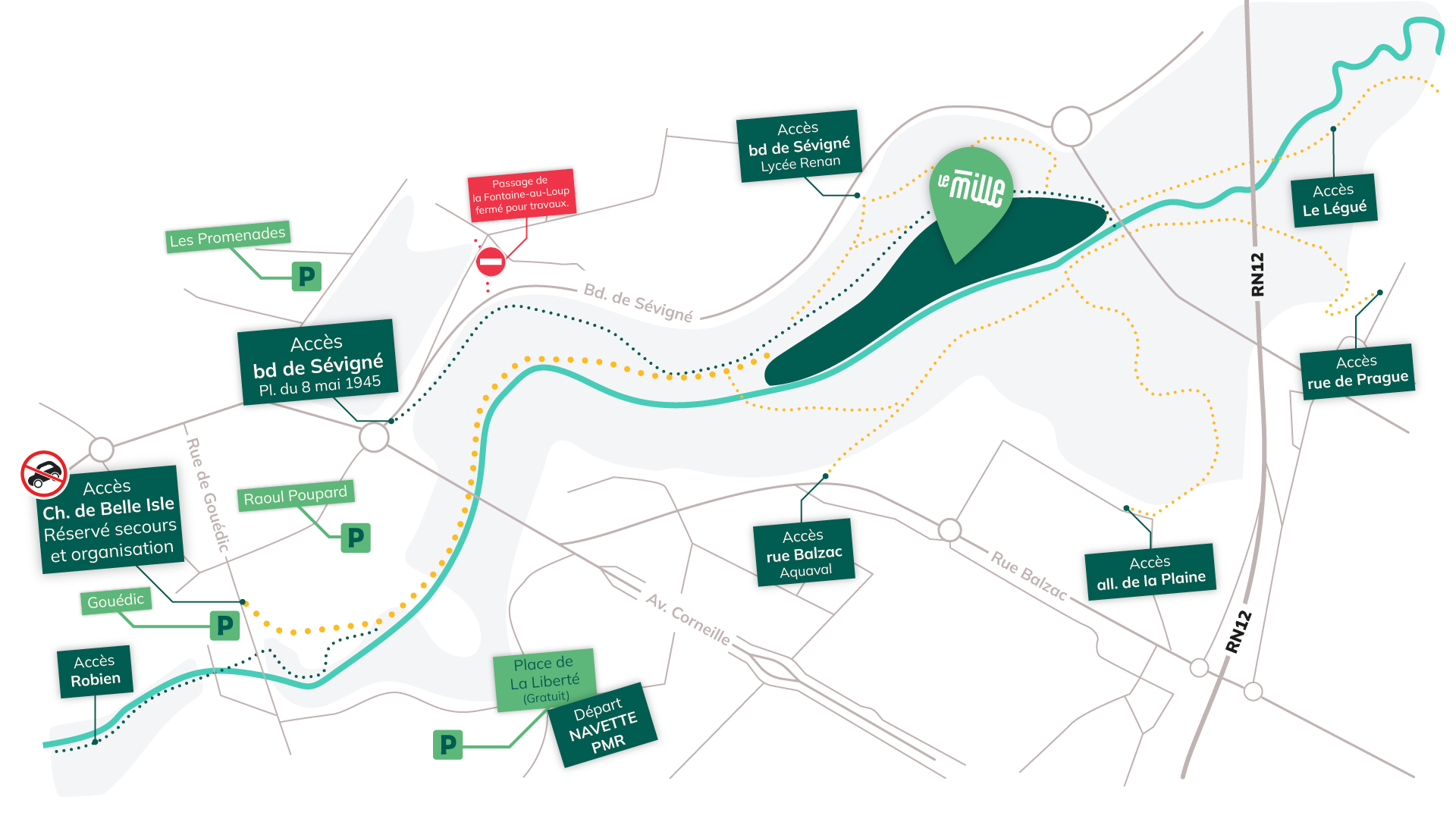 Néanmoins, certains d’entre eux seront fermés pour des questions de sécurité. Nous recommandons de passer via le Chemin de Belle-Isle depuis la rue de Gouédic, seul chemin éclairé de nuit.
